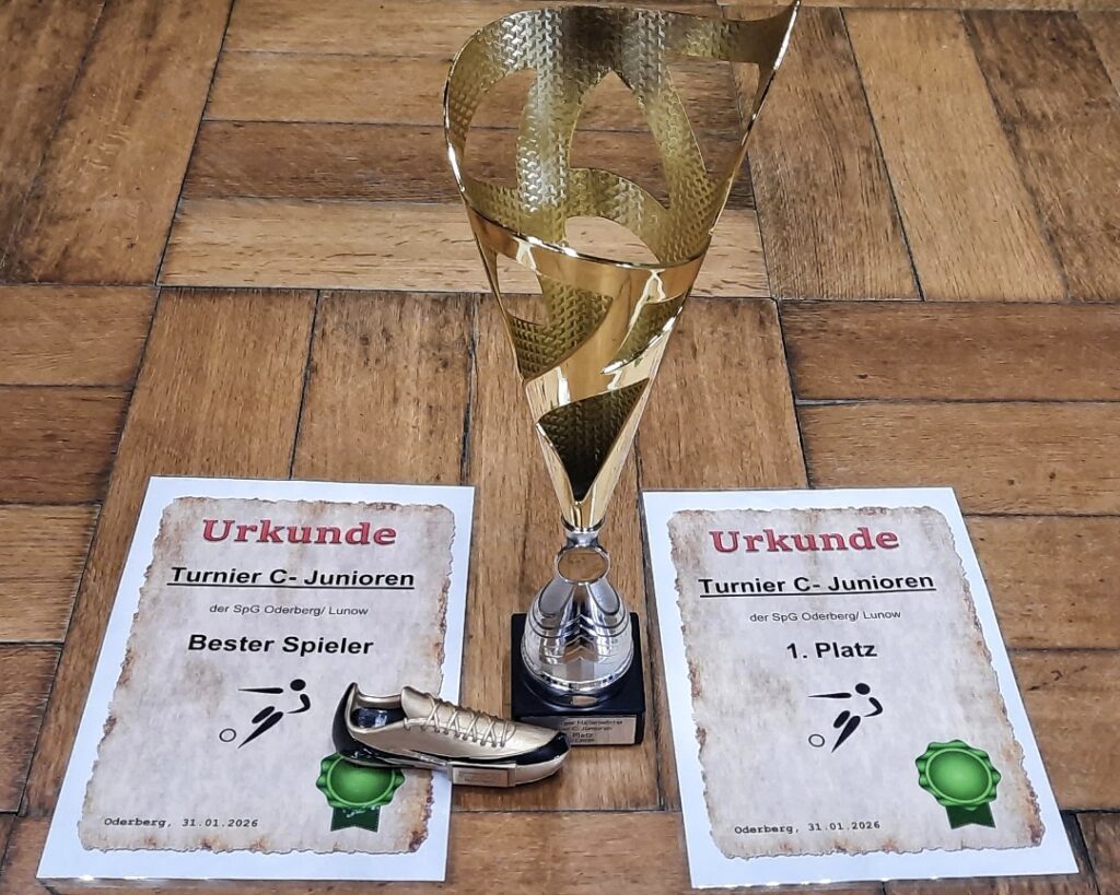 Ein starkes Starterfeld erwartete unsere C-Junioren im Oderberger Hallenwinter! 7 Mannschaften traten im Modus jeder gegen jeden an. Schwierig einzuschätzenende Gegner, die allesamt schon erfolgreiche Turniere hinter sich hatten. Unsere Zielvorgabe war klar: nicht letzter werden! Um so erfreulicher, dass alle Vorgaben mehr als erfüllt wurden. Denn die Mannschaft setzte das in den Trainingseinheiten Geübte sehr gut um. Zielstrebig in der Offensive gepaart mit konzentrierter Defensivarbeit war an diesem Tag das Erfolgsrezept. 5 verschiedene Torschützen und lediglich ein Gegentor standen am Ende zu Buche und bedeutete Platz 1 in der Endabrechnung! Lakischas Auszeichnung zur besten Spielerin rundete das super Ergebnis ab!